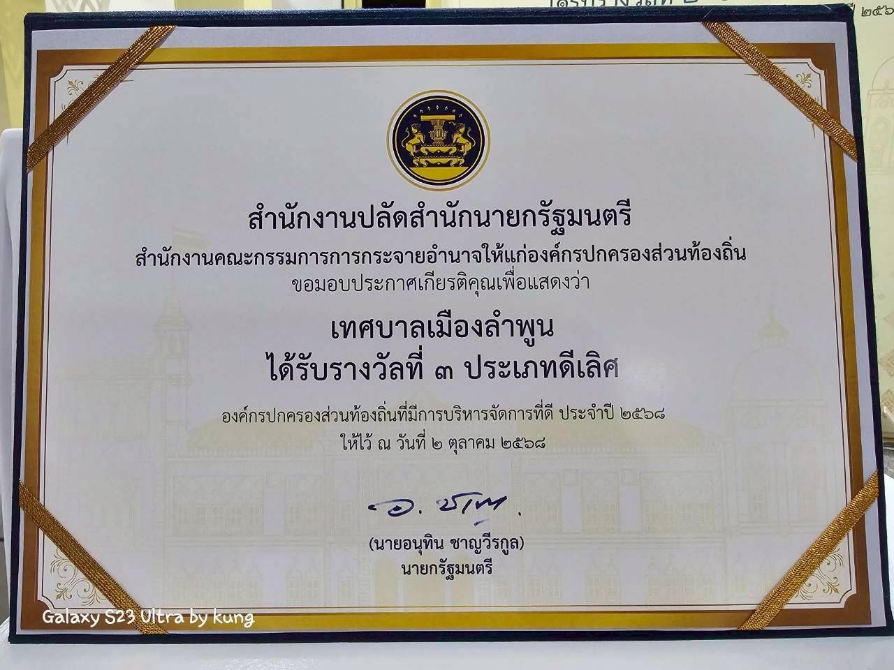 วันที่ 2 ตุลาคม 2568 เทศบาลเมืองลำพูน ร่วมพิธีมอบรางวัลองค์กรปกครองส่วนท้องถิ่นที่มีการบริหารจัดการที่ดี ประเภทดีเลิศประจำปีงบประมาณ พ.ศ. 2568 จัดโดย สำนักงานปลัดสำนักนายกรัฐมนตรี นายประภัสร์ ภู่เจริญ นายกเทศมนตรีเมืองลำพูน รับรางวัลองค์กรปกครองส่วนท้องถิ่นที่มีการบริการจัดการที่ดี ประจำปีงบประมาณ 2568 ซึ่งเทศบาลเมืองลำพูนได้รับรางวัลที่ 3 ประเภทดีเลิศ โอกาสนี้ นายอนุทิน ชาญวีรกูล นายกรัฐมนตรีเป็นประธานในพิธีมอบรางวัล ให้กับองค์กรปกครองส่วนท้องถิ่นที่ได้รับรางวัล จำนวนทั้งสิ้น 52 รางวัล จากองค์กรปกครองส่วนท้องถิ่นทั่วประเทศ ซึ่งเทศบาลเมืองลำพูนได้ร่วมจัดแสดงนิทรรศการนวัตกรรมโครงการ “ระบบการดูแลสุขภาพที่เป็นมิตรกับผู้สูงอายุ (Lamphun Age – Friendly Health Care Model)” เพื่อแสดงศักยภาพของหน่วยงานในการบริหารจัดการองค์กรอย่างมีประสิทธิภาพ จัดขึ้น ณ ห้องแกรนด์ ไดมอนด์ บอลรูม อาคารอิมแพค ฟอรั่ม เมืองทองธานี อำเภอปากเกร็ด จังหวัดนนทบุรี