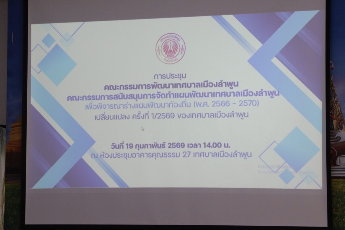 วันที่ 19 กุมภาพันธ์ 2569 นายประภัสร์ ภู่เจริญ นายกเทศมนตรีเมืองลำพูน เป็นประธานเปิดการประชุม คณะกรรมการพัฒนาเทศบาลเมืองลำพูน และคณะกรรมการสนับสนุนการจัดทำแผนพัฒนาเทศบาลเมืองลำพูน เพื่อจัดทำและพิจารณาร่างแผนพัฒนาท้องถิ่น (พ.ศ.2566-2570) เปลี่ยนแปลง ครั้งที่ 1/2569 ของเทศบาลเมืองลำพูน ตามระเบียบกระทรวงมหาดไทยว่าด้วยการจัดทำแผนพัฒนาขององค์กรปกครองส่วนท้องถิ่น พ.ศ.2548 และที่แก้ไขเพิ่มเติมถึง (ฉบับที่ 3) พ.ศ.2561